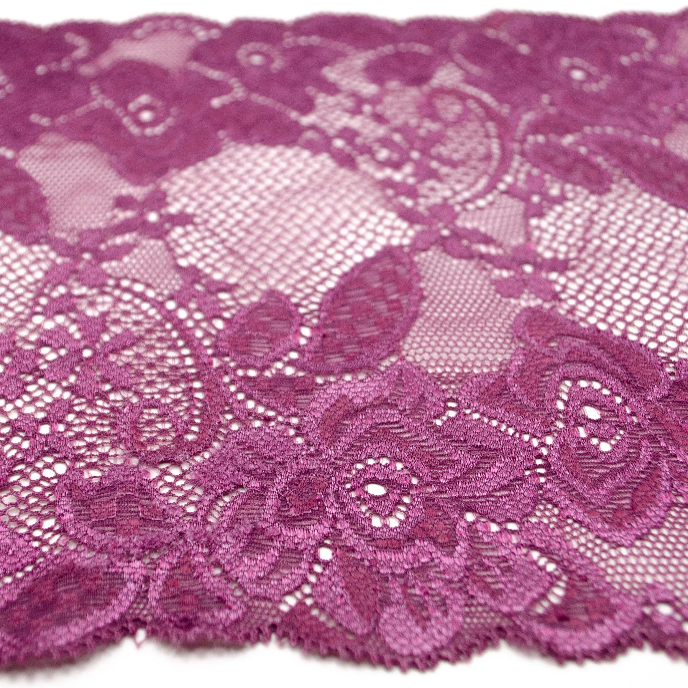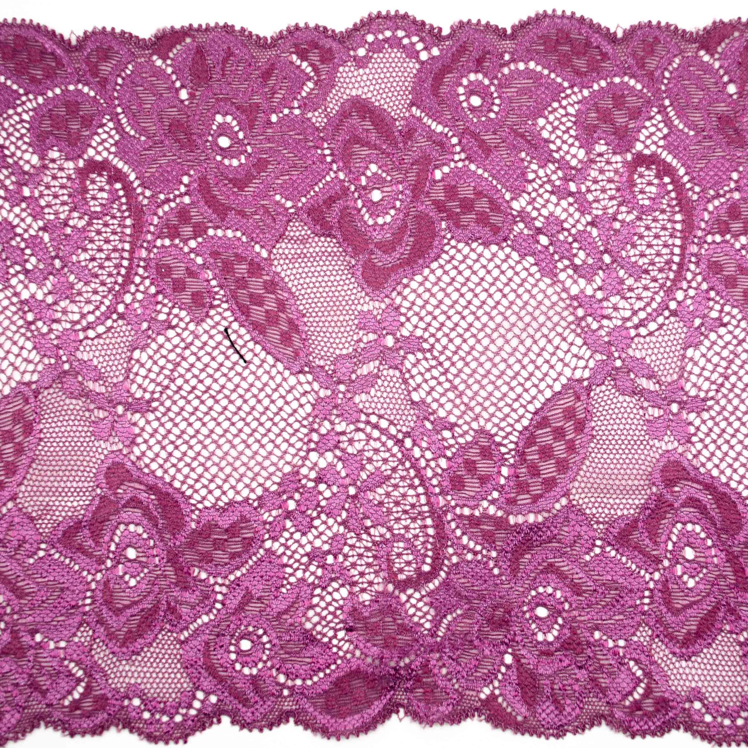CARRETE DE ENCAJE, COMPOSICIÓN: NYLON 90% ELASTANO 10% DE COLOR MORA LECHE Y DIMENSIONES: ANCHO: 17 CMS Y LARGO: 125 Mts